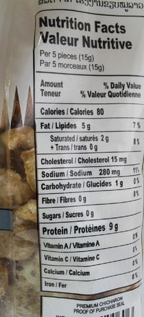 PORK RINDS - Brim's Snack Foods Brimhall Foods began as a one truck DSD Distributor in 1979. We distribute Potato Chips, Tortilla Chips, and Salsa Dip; all in the BRIM'S label. Pork 101: Nutrition Facts and Health Effects Pork is an excellent source of many vitamins and minerals, including thiamine, zinc, vitamin B12, vitamin B6, niacin, phosphorus, and iron. Other meat compounds Similarly to plants, animal foods... Calories in Kitchen Cooked Pork Rinds and Nutrition Facts Pork Rinds Nutrition Facts Serving Size 1/2 oz (14 g) Amount Per Serving Calories 80 % Daily Values* Total Fat 6.00g 8% Saturated Fat 2.000g 10% Trans Fat 0.000g Cholesterol 15mg 5% Sodium 310mg 13% Total Carbohydrate 0.00g 0% Dietary Fiber - Sugars - Protein 7.00g Vitamin D - Calcium - Iron - Potassium - Mac's Fried Pork Skins, Original: Calories, Nutrition ... - Fooducate Nutrition Serving Size: 0.5 oz (s) - 14 g Amount per Serving My Daily Value Calories 80 Kcal 5% Total Fat 5 g 8% Saturated Fat 2 g 12% Trans Fat 0 g 0% Cholesterol 15 mg 5% Sodium 220 mg 10% Total Carbohydrate 0 g 0% Dietary Fiber 0 g 0% Sugars 0 g 0% Added Sugars 0 g 0% Protein 9 g 19% Vitamin A 0 mcg 0% Vitamin C 0 mg 0% Calcium 0 mg 0%