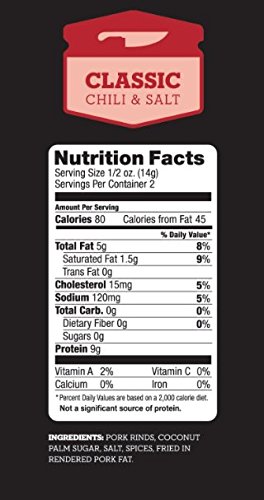 Pork rinds nutrition label. Hot Pork Rinds | Brim's Snack Foods Ingredients. PORK RINDS, HOT SEASONING (SALT, MALTODEXTRIN, SODIUM DIACETATE [8.1%], MONSODIUM GLUTAMATE, HOT SAUCE [CAYENNE PEPPER, DISTILLED VINEGAR, SALT, GARLIC POWDER], ONION POWDER, SUGAR, CITRIC ACID, SPICES, NATURAL FLAVORS, RED 40 LAKE, DISODIUM INOSINATE AND DISODIUM GUANYLATE, SOYBEAN OIL [PROCESSING AID], <2%SILICON DIOXIDE ... The 6 Best Pork Rinds Brand for Keto Diet: The Ultimate ... - KetoaHolics Korean Kimchi, Sea Salt and Cracked Black Pepper, Spicy Dill, Pineapple Ancho Chile, Thai Style Curry, Pasilla Chili Cheese. Since fried pork skin is considered to be a keto-friendly snack, it has become quite popular recently. Because of this, you'll come across different pork rind brands in the market. Why Natural Pork Rinds are Some Nutritionist's New Favorite And with 80 calories and 5 to 6 grams of fat per serving, many nutrition experts are claiming natural pork rinds (a.k.a. chicharrones and cracklins) are a way better way to satiate your salty, savory, crunchy cravings than other snacks, like potato chips. So, what makes 4505 Meats chicharrones a favorite among fans and nutritionists alike? Pork Rinds Nutrition Information - LIVESTRONG.COM Pork rinds are loaded with calories. A small 1-ounce serving, weighing a little over 28 grams, has 160 total calories, according to the USDA. Over half of the overall calories — 56 percent —come from fat. On the other hand though, all of the remaining calories are from protein. You'll get 16 g protein in the same small serving.