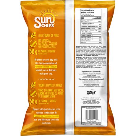 Our Products - Sun Chips SUNCHIPS ® HARVEST CHEDDAR ® Flavored Whole Grain Snacks Description The flavor of real cheddar cheese is layered onto a delicious whole grain chip to create this tasty combination. Nutrition Facts Ingredients Buy Now Please note that some products may not be available in your area. Please check with your local grocer regarding availability. Sun Chips 100% Whole Grain Snacks Harvest Cheddar SunChips Harvest Cheddar Flavored Whole Grain Snacks contain 6 g of fat per 1 oz serving. Heart Healthy: Diets rich in whole grain foods and other plant food, and low in saturated fat and cholesterol, may reduce the risk of heart disease. 100% Whole Grain: 19 g or more per serving. Eat 48 g or more of whole grains daily. Sunchips Nutrition Label : Sun Chips Whole Grain Snacks French Onion ... Sunchips individual bag, 1.5 oz. Nutrition facts · 100% whole grain · 30% less fat than regular chips · heart healthy · no artificial flavors. Calories, carbs, fat, protein, fiber, cholesterol, and more for sunchips ( snacks, fritolay, multigrain snack, harvest chedd…). Sunchips individual bag, 1 package. 6 Surprising Sun Chips Facts We Bet You Didn't Know The ingredient in the chips associated with GMO corn is Maltodextrin, which is known to cause gastrointestinal issues in some people. When it comes to nutrition, Sun Chips aren't the wholesome snack you thought they were—they pack a ton of sodium (120mg), and a significant amount of fat (6g) per serving. 6 Original Sun Chips are vegan