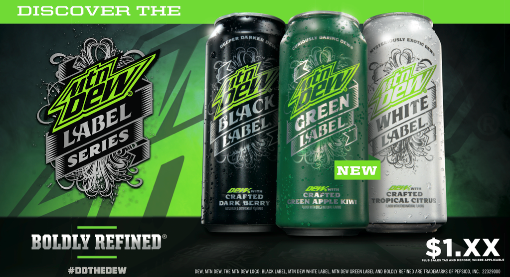 Mountain Dew Label Series - G&M Distributors After exploring Dew's deeper, darker side, the Label series will venture into the Mysteriously Exotic and the Curiously Daring .. Launch Timing: January (White) & March (Green) 2017 Green Label: Crafted with green apple, kiwi and lime flavors White Label: Crafted with pineapple, grapefruit and peach flavors Product Details: 16 oz. matte can, 12 cans per case; 140 calories per 16 oz. Mtn Dew Label Series Brings Two New Unique Premium Beverages The Mtn Dew Label Series will launch in a big way with Label Motel, transforming the everyday into a bold and refined experience as DEW takes over and completely converts the Musicland Hotel in...