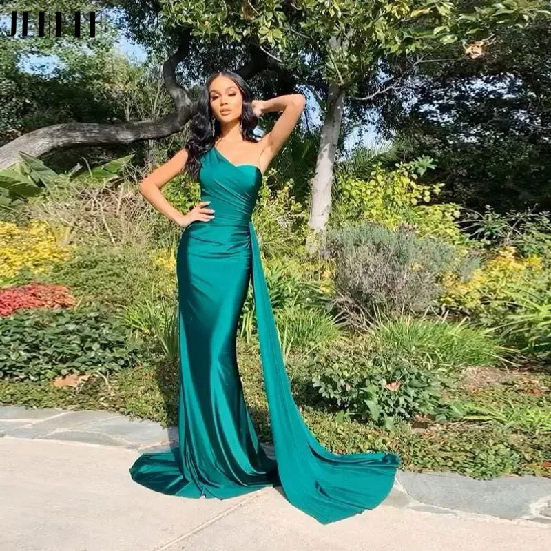JEHETH Sexy Green One Shoulder Formal Evening Dresses Women Elegant Mermaid Floor-Length Sweep Train Long Prom Gowns