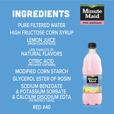 › products › lemonade-and-fruitLemonade - Lemonade & Fruit Drinks | Minute Maid® contains pure filtered water, high fructose corn syrup, lemon juice from concentrate, less than 0.5% of: natural flavors, citric acid (provides tartness), modified cornstarch, glycerol ester of rosin, sodium benzoate and potassium sorbate and calcium disodium edta (to protect taste), yellow #5. Pink Lemonade - Lemonade & Fruit Drinks | Minute Maid® A twist on something sweet, Minute Maid® Pink Lemonade is made with real lemons for a deliciously sunny, smile-inducing taste that truly refreshes. Try a glass! ... 20 fl oz . Click on the button to find out the available online retailers to buy the product! ... Nutrition Facts 7 servings per container. Serving size 8 fl oz (240 mL) Amount per ... Zero Sugar Lemonade - Low Sugar Juice | Minute Maid® Give your taste buds something to smile about with Minute Maid® Zero Sugar Lemonade. It’s the great taste you know and love, with zero grams of sugar per serving. ... 20 fl oz . 16.9 fl oz, 6 Pack . 12 fl oz, 12 Pack ... Nutrition Facts 7 servings per container. Serving size 8 fl oz ... Minute Maid Lemonade 591ml (20 oz) calories, carbs & nutrition facts ... Find calories, carbs, and nutritional contents for Minute Maid Lemonade 591ml (20 oz) and over 2,000,000 other foods at MyFitnessPal