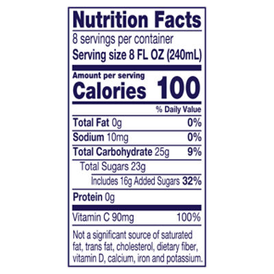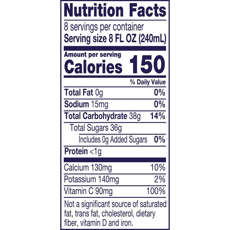 Welch's grape juice nutrition label. Easy Grape Jam Recipe - Serious Eats Sep 11, 2020 · In the same, nonreactive saucepan, stir grape pulp together with sugar, pectin, and citrus juice and bring to a boil over high heat. Cook until mixture registers 220°F (104°C) on a candy or instant-read thermometer. 18 Worst Healthy Juice Brands & What to Buy Instead - Eat This … Apr 15, 2020 · Welch's 100 percent Grape Juice with Fiber. PER 8 FL OZ: 150 calories, 0 g fat, 20 mg sodium, 41 g carbs (3 g fiber, 36 g sugar), ... Until the new nutrition label comes out in 2018 that instructs manufacturers to list nutritionals for the entire bottle rather than a cup, ... Calories in Welch's 100% White Grape Juice | CalorieKing Calorie Breakdown. Where do the calories in Welch's 100% White Grape Juice come from? 2.6% 97.4% Protein Total Carbohydrate 140 cal. * The % Daily Value (DV) tells you how much a nutrient in a serving of food contributes to a daily diet. 2,000 calories a day is used for general nutrition advice. Your daily values may be higher or lower ... Welches Grape Juice Nutritional Facts | Healthfully An 8-oz. serving of Welch's grape juice contains 170 calories. This is high in calories for a beverage, and it accounts for 8.5 percent of the calories you may consume each day. Consider eating a handful of grapes if you crave the sweet flavor instead of drinking juice -- it saves calories and offers better nutrition, including fiber.