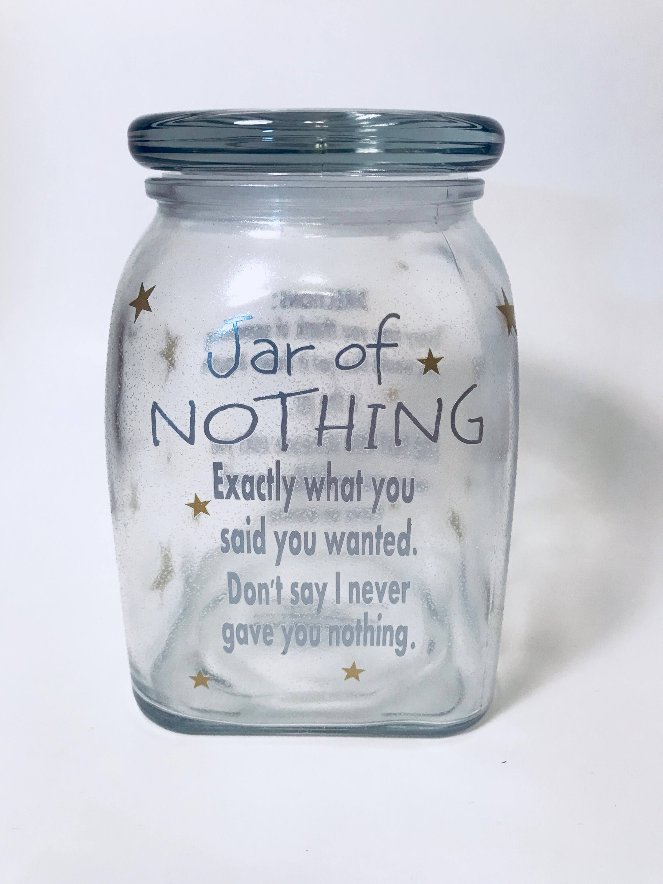 › poetrymagazine › poemsAnecdote of the Jar by Wallace Stevens | Poetry Magazine The jar was round upon the ground. And tall and of a port in air. It took dominion everywhere. The jar was gray and bare. It did not give of bird or bush, Like nothing else in Tennessee. Source: The Collected Poems of Wallace Stevens (Alfred A. Knopf, 1990) This Poem Appears In. › gift-ideas › 3486-jar-of-nothingJar of "Nothing" | Gag Gift Idea - Budget101.com™ Jul 7, 2011 · Jar of "Nothing". Don’t you just love it when you ask someone what they want for Christmas (or birthday, anniversary, graduation, etc) and they say “Nothing”?! Well, here is the perfect gift idea for that person, a Jar of Nothing. Print the following saying onto a label and affix it to the jar. › smart-living › photo-galleryJar of Nothing | The Best White Elephant Holiday Gifts to Shop in... Dec 22, 2019 · Jar of Nothing Image Source: amazon.com. You truly can't go wrong with a Jar of Nothing ($11). Jar of Nothing $11. from amazon.com. Buy Now. Bseen Foot Hammock Image Source: amazon.com.
