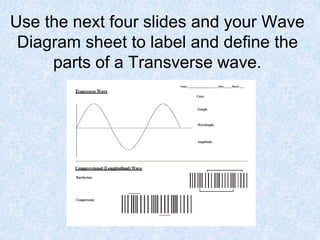 PDF Physics P Worksheet 9-4: Waves - Trunnell's Physics The illustration below shows a series of transverse waves. Label each part in the space ... transverse wave is the _____ while the lowest part is the _____. 4. The _____ is the height of the wave. 5. The distance from one crest to the next is the _____. 6. Below are pictures of pieces of waves. Underneath each diagram write the numbers of ...