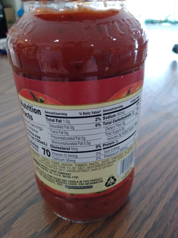 Prego Low Sodium Spaghetti Sauce Nutrition Facts Prego Italian Sauce Traditional Lower Sodium Calories How To Find A Low Sugar Spaghetti Sauce Prego Spaghetti Sauce Plain 67 Oz 6 Case Lower Sodium Traditional Italian Sauce Prego Pasta Sauces Spaghetti Sauce Nutrition Prego Nutritionwalls Prego Sauce Nutrition Label Best Ideas 2019 Prego Traditional Italian Sauce 67 Oz Boxed Prego® Lower Sodium Traditional Italian Sauce, 23.5 oz Prego® Lower Sodium Traditional Italian Sauce ; Trans Fat0g ; Polyunsaturated Fat0g ; Monounsaturated Fat0.5 ; Dietary Fiber3g ; Sugar9g ... Prego® Traditional Pasta Sauce with Classic Italian Flavor and Homemade ... 100 Calories or Less Per Serving; Sodium 141-480 mgs Per Serving Ingredients TOMATO PUREE (WATER, TOMATO PASTE), DICED TOMATOES IN TOMATO JUICE, SUGAR, VEGETABLE OIL (CORN, AND/OR CANOLA), CONTAINS LESS THAN 1% OF: SALT, DEHYDRATED ONIONS, SPICES, DEHYDRATED GARLIC, CITRIC ACID, ONION EXTRACT, GARLIC EXTRACT. Prego Chunky Garden Combo Pasta Sauce, 23.75 oz - Kroger Shop for Prego Chunky Garden Combo Pasta Sauce (23.75 oz) at Kroger. Find quality pasta, sauces, grain products to add to your Shopping List or order online for Delivery or Pickup. ... Sodium 470mg 20%. Total Carbohydrate 11g 4%. Dietary Fiber 2g 7%. Sugar 8g 0%. Added Sugar 3g 6%. ... , nutritional, or proper usage information than the ...